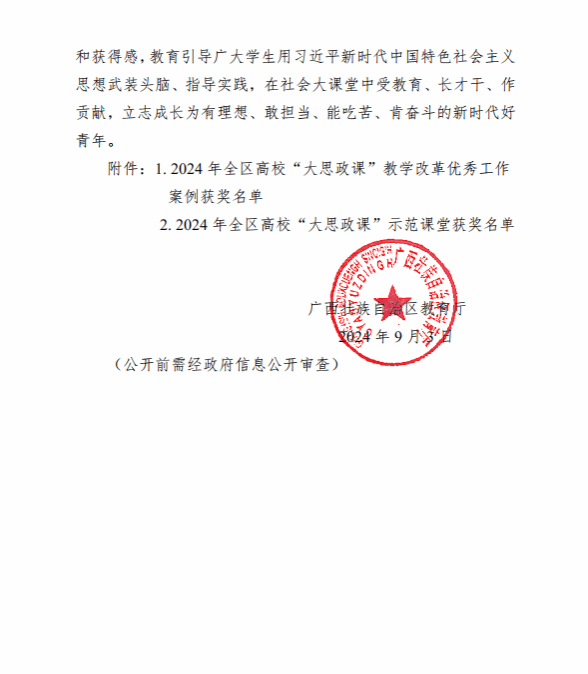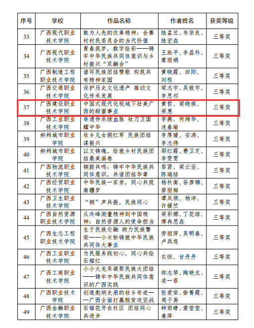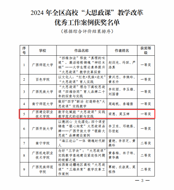 廣西建院9月6日訊(馬克思主義學院 宋佳雄)近日,自治區(qū)教育廳公布了2024年全區(qū)高校“大思政課”教學改革優(yōu)秀工作案例和示范課堂征集活動獲獎名單。我校馬克思主義學院教師梁惠、莫玉嬋的作品《數字化賦能“大思政課”實踐教學范式的創(chuàng)新與實踐》榮獲“優(yōu)秀工作案例”一等獎,毛娟翠、張博聞、畢莉的作品《傳承八桂鄉(xiāng)情,構筑中華民族共有精神家園》榮獲高職高專組“示范課堂”二等獎,黃哲、梁曉祺、梁惠的作品《中國式現(xiàn)代化視域下壯美廣西的甜蜜事業(yè)》及江紫鳳、譚臻、劉荔源的作品《“三堅持”走好群眾路線 各民族共鑄“石榴情深”》分別榮獲高職高專組“示范課堂”三等獎。