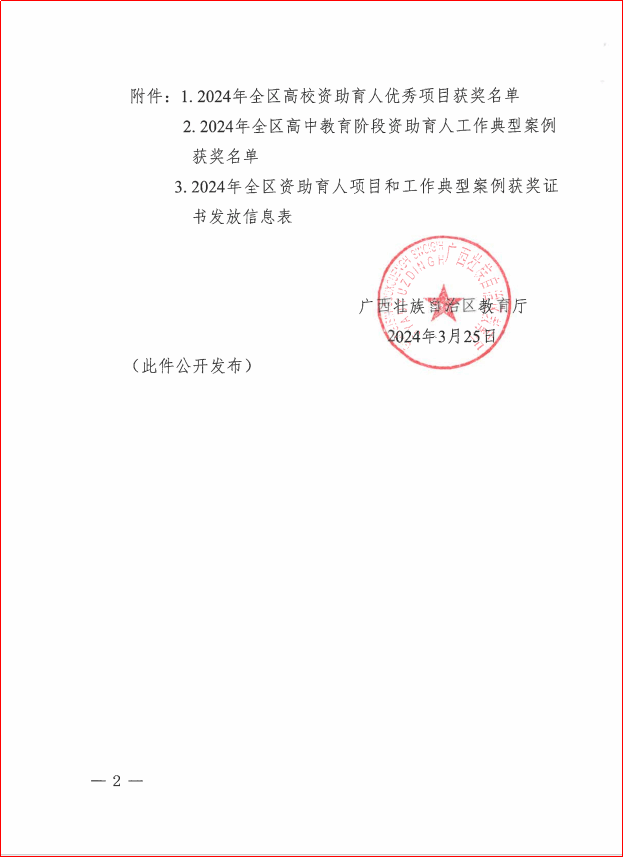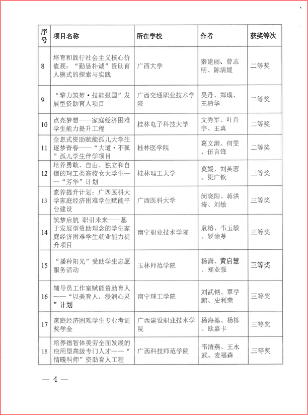 廣西建院4月7日訊(黨委學(xué)生工作部 歐嘉卡 楊棟)近日,自治區(qū)教育廳印發(fā)《關(guān)于公布2024年全區(qū)資助育人項目和工作典型案例評選活動獲獎名單的通知》(桂教資助〔2024〕4號),在全區(qū)高校范圍內(nèi)共評選出資助育人優(yōu)秀項目20項。我校申報的項目《家庭經(jīng)濟困難學(xué)生專業(yè)考證獎學(xué)金》榮獲“2024年全區(qū)高校資助育人優(yōu)秀項目”三等獎。
