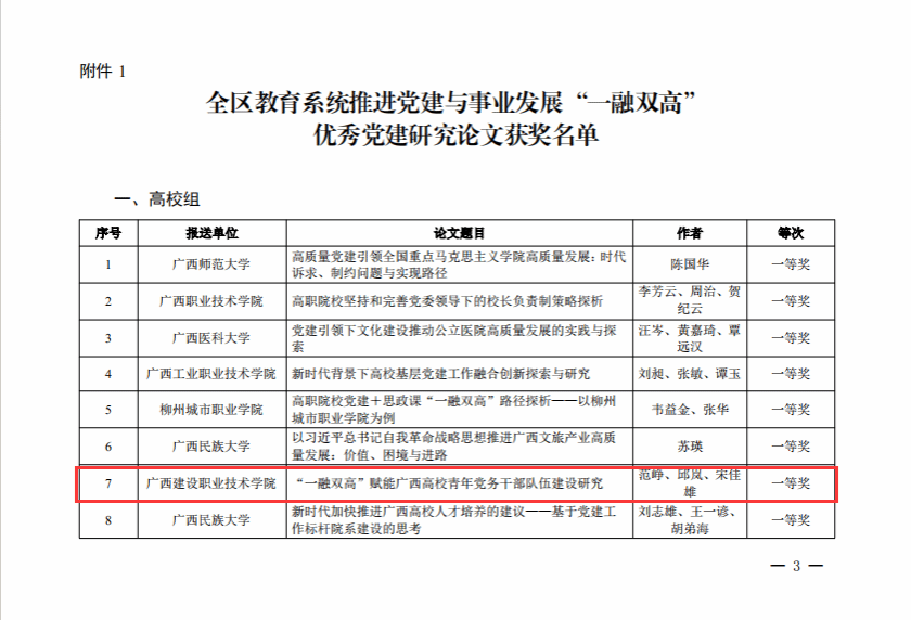 廣西建院4月10日訊(馬克思主義學院 曹桃) 近日,自治區黨委教育工委公布了全區教育系統推進黨建與事業發展“一融雙高”優秀黨建研究論文和創新典型案例評審結果,我校馬克思主義學院教師范崢、邱嵐、宋佳雄的論文《“一融雙高”賦能廣西高校青年黨務干部隊伍建設研究》榮獲優秀黨建研究論文一等獎。