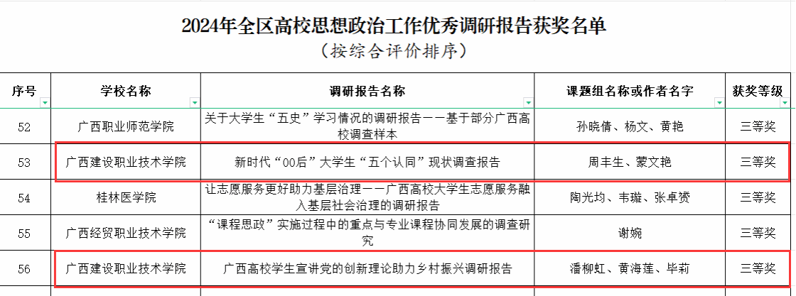 廣西建院5月15日訊(馬克思主義學院 曹桃) 近日,自治區教育廳公布了2024年全區高校思想政治工作優秀調研報告和工作案例獲獎名單,我校榮獲優秀工作案例二等獎1項,優秀調研報告三等獎2項。