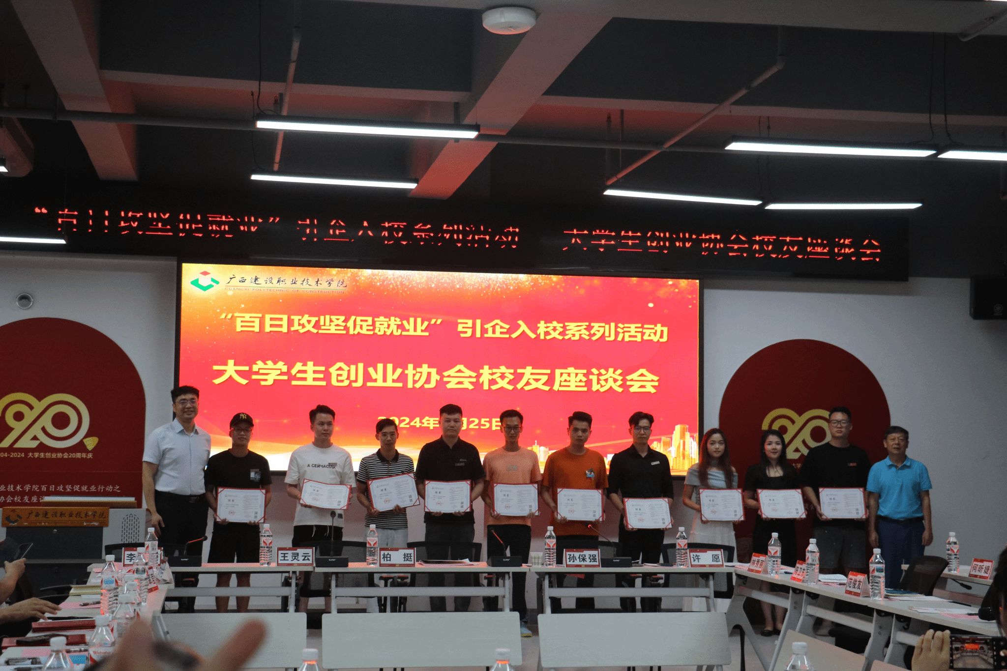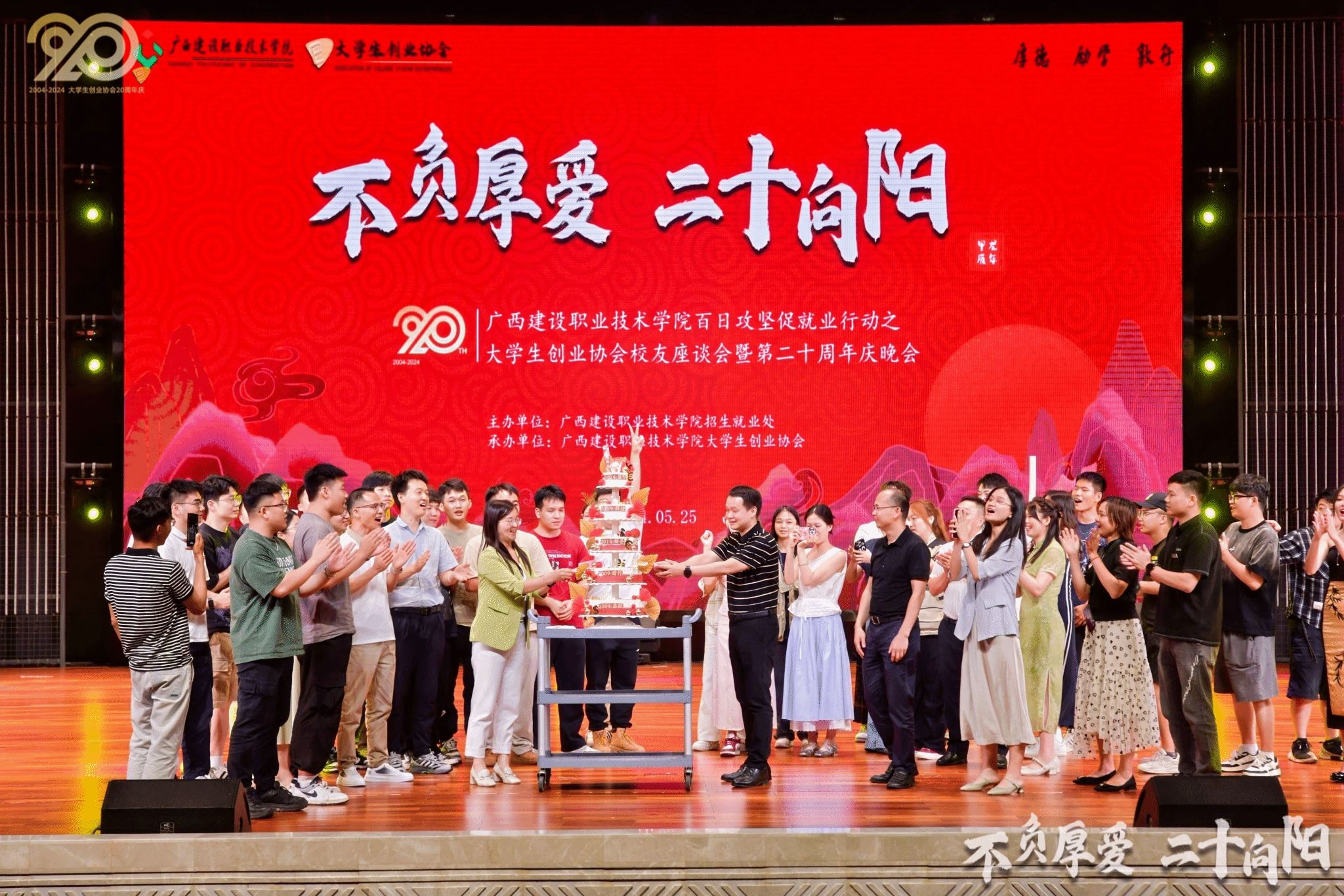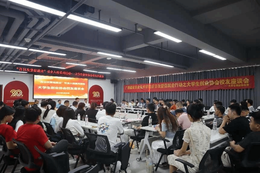廣西建院5月27日訊(文/招生就業處 練翠瀅 圖/創業協會)為全面總結大學生創業協會的發展成績和經驗,促進和加強協會校友間、校友與母校間的聯系,發揮校友在畢業生就業中的積極作用,5月25日,大學生創業協會舉行校友座談會暨20周年慶祝活動。學校副校長柏挺,校友辦常務副主任王靈云、招生就業處副處長晏毅、歷任及現任指導老師和返校協會校友代表,共計140余人參加校友座談會,招生就業處處長孫保強主持會議。
