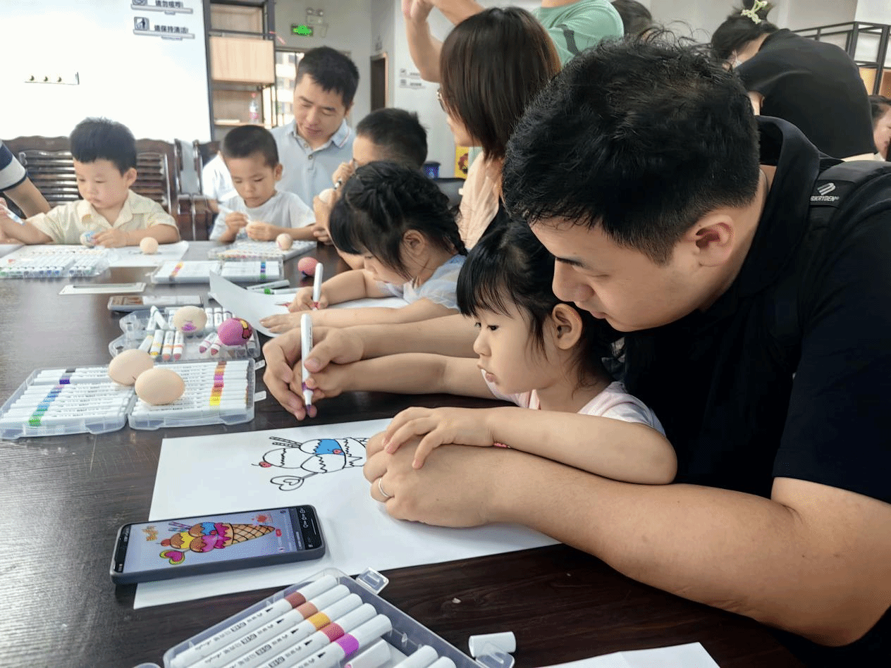 在親子手工制作環節,家長和孩子們攜手合作,共同挑戰在雞蛋上布袋上繪畫、制作蛋兜,現場氣氛熱烈而溫馨。