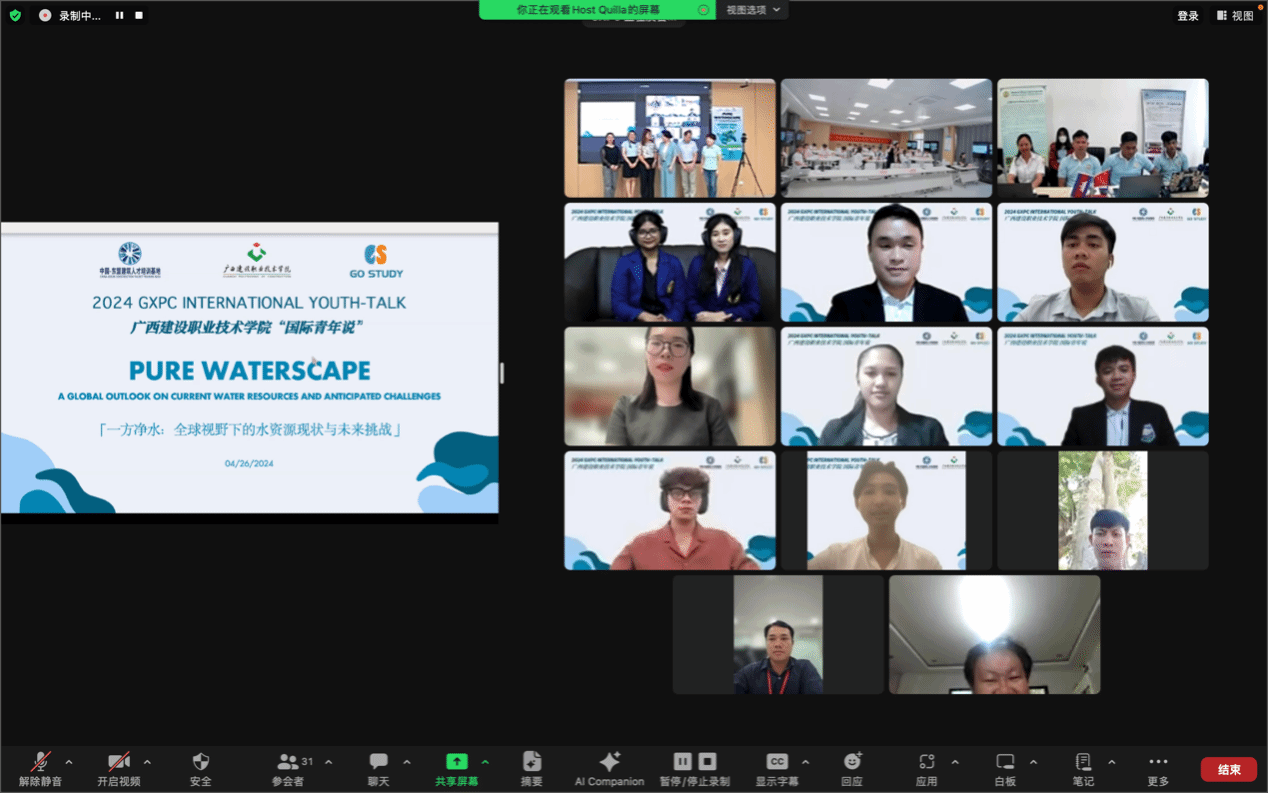 學(xué)校舉辦了“國(guó)際青年說(shuō)”活動(dòng),以“一方凈水:全球視野下的水資源現(xiàn)狀與未來(lái)挑戰(zhàn)”為題,匯集了12個(gè)國(guó)家的青年大學(xué)生及專業(yè)人士,近百名師生通過(guò)線上及線下會(huì)場(chǎng)參與交流活動(dòng)。其中,9個(gè)演講團(tuán)隊(duì)分別來(lái)自廣西建設(shè)職業(yè)技術(shù)學(xué)院、柬埔寨國(guó)家技術(shù)培訓(xùn)學(xué)院、印度尼西亞三寶壟大學(xué)、柬埔寨理工學(xué)院、菲律賓卡皮茲國(guó)立大學(xué)及老撾占巴塞大學(xué)。通過(guò)活動(dòng)的開(kāi)展,學(xué)校與各國(guó)際伙伴進(jìn)行了深度的鏈接與關(guān)系的鞏固。