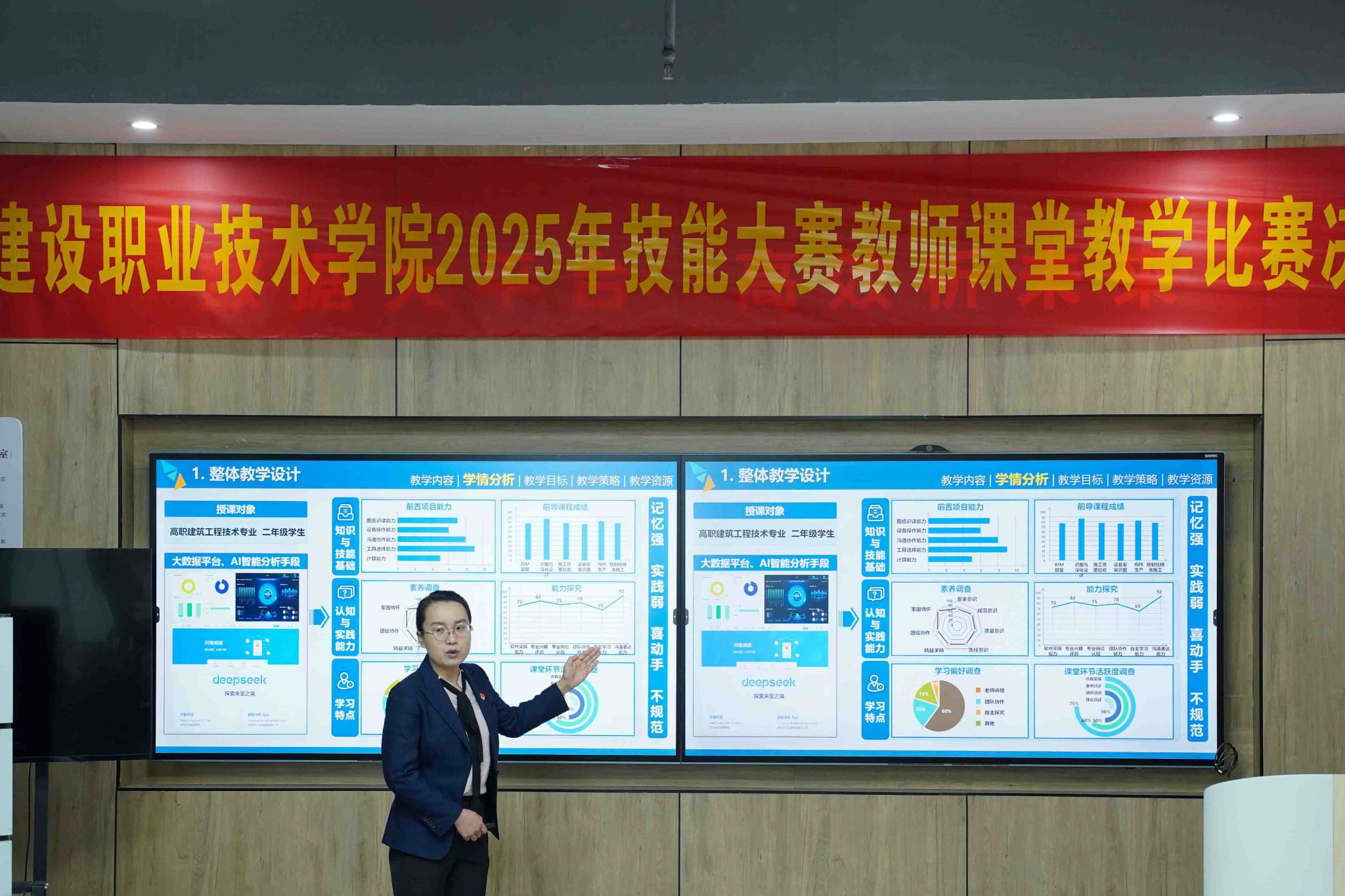 本次比賽經二級學院初賽選拔推薦,共有15個教學團隊60名教師進入決賽。決賽分教學實施報告匯報、現場課堂教學展示和答辯三個環節。參賽教師緊扣比賽要求,落實以生為本,突出產教融合,運用先進數字技術更新課堂,教學講解和操作配合恰當,充分展現了我校教師良好的“雙師”素養和教學風采。