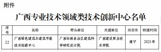 近日,自治區科技廳公布廣西專業技術領域類技術創新中心名單,我校與下屬企業廣西壯族自治區建筑科學研究設計院聯合共建的“廣西綠色建筑與建筑節能技術創新中心”(以下簡稱“中心”)通過嚴格評估,成功上榜。這一突破標志著該中心在平臺能級、科研創新與產業服務能力等方面邁上新臺階,將為區域建筑產業綠色化、智能化轉型注入更強動能。