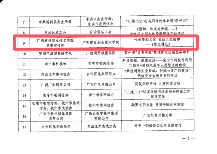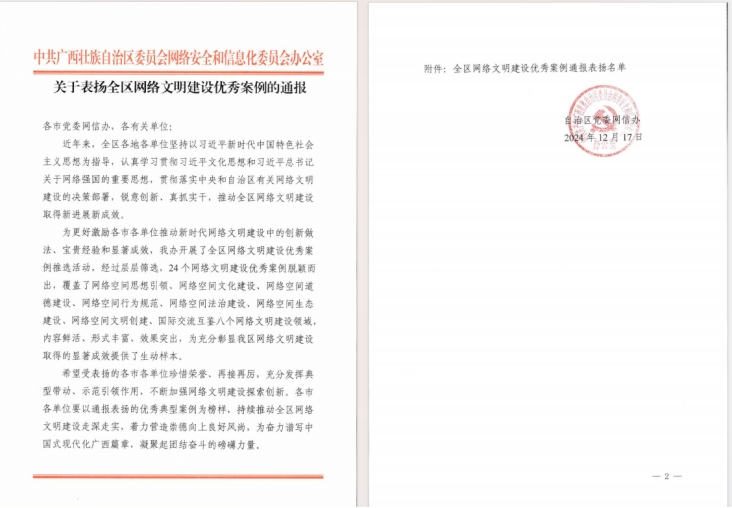 《魯班講壇》成功入選全區(qū)網(wǎng)絡(luò)文明建設(shè)優(yōu)秀案例,并獲通報表揚。我校案例是全區(qū)教育系統(tǒng)唯一入選案例,并被編入2024年廣西網(wǎng)絡(luò)文明大會的優(yōu)秀案例集。