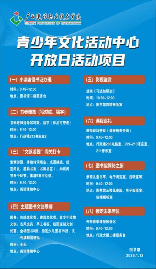 為深入踐行高校服務社會、文化育人的使命,推動優質教育資源向社區開放共享,廣西建設職業技術學院精心籌建了“青少年文化活動中心”。該中心旨在充分發揮高校師資專業優勢、圖書館豐富藏書與多元空間資源,打造一個面向青少年及社區的公益文化服務平臺,促進知識傳播、美育啟蒙與社區融合。