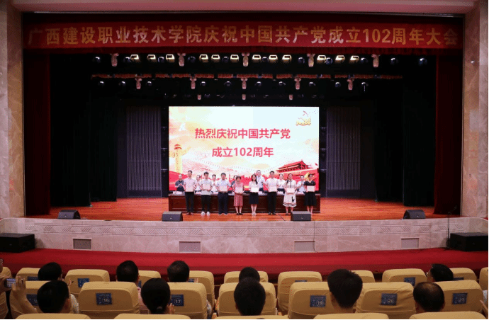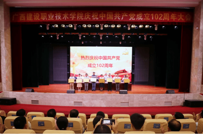 廣西建院6月27日訊(文/黨委宣傳部 陳熙 圖/黨委宣傳部 韋植巍 記者團 楊貴維 鐘田 阮倩)為慶祝中國共產黨成立102周年,6月27日下午,我校在禮堂召開慶祝建黨102周年大會。會議旨在回顧黨的光輝歷程,謳歌黨的豐功偉績,激勵各級基層黨組織大力弘揚偉大建黨精神,深入學習貫徹習近平新時代中國特色社會主義思想和黨的二十大精神,凝聚學校高質量發展的磅礴力量。