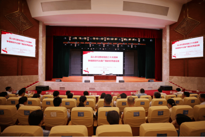 廣西建院6月30日訊(文/黨委宣傳部 陳熙 圖/黨委宣傳部 記者團(tuán) 楊貴維)為進(jìn)一步加強(qiáng)我校思想政治教育工作,不斷推動(dòng)學(xué)校事業(yè)高質(zhì)量發(fā)展,6月30日下午,自治區(qū)住房城鄉(xiāng)建設(shè)廳黨組書記、廳長(zhǎng)楊綠峰蒞臨我校,以《深入學(xué)習(xí)貫徹黨的二十大精神 爭(zhēng)做新時(shí)代壯美廣西的優(yōu)秀建設(shè)者》為題給在校師生上了一堂內(nèi)容豐富的思想政治教育課。講座由學(xué)校黨委書記劉曉紅主持。