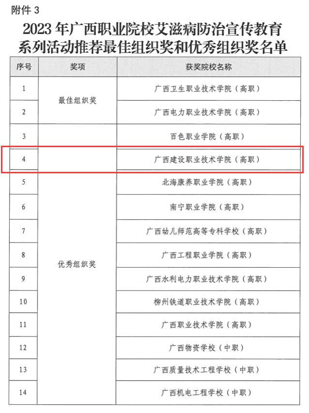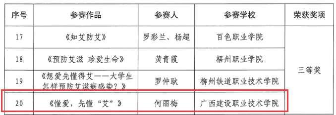 廣西建院7月14日訊(黨委學生工作部 周曉卉)近日,在自治區衛生健康委、自治區教育廳舉辦的廣西職業院校艾滋病防治宣傳教育系列活動中,我校榮獲優秀組織獎。同時,我校何麗梅老師在“我是防艾衛士”微課比賽中榮獲三等獎;我校老師指導學生作品在“你我來防艾”短視頻征集大賽中分別榮獲三等獎1項、優秀獎9項。