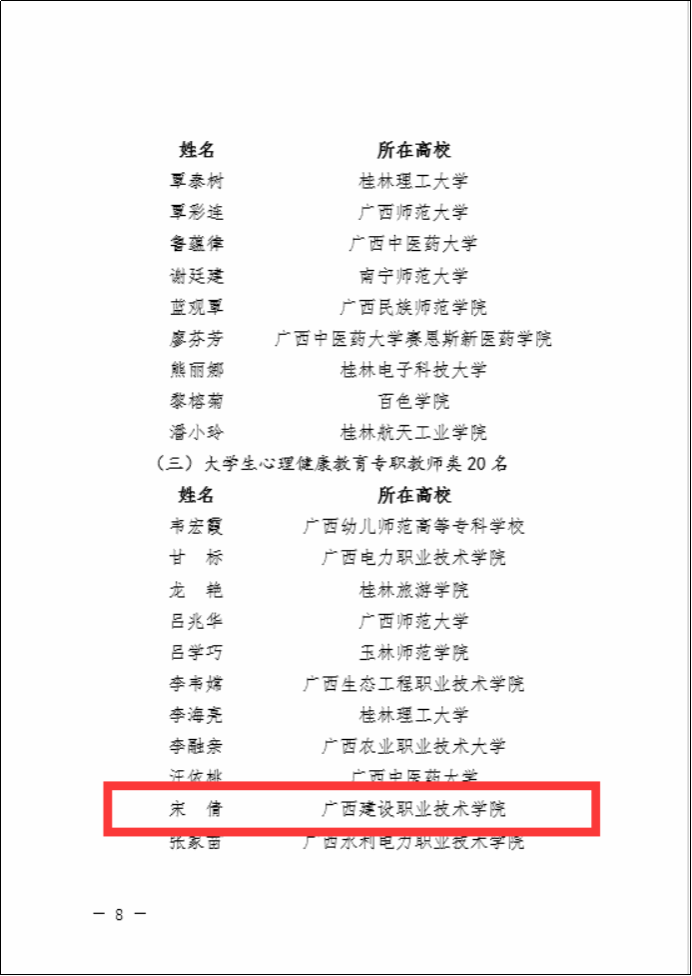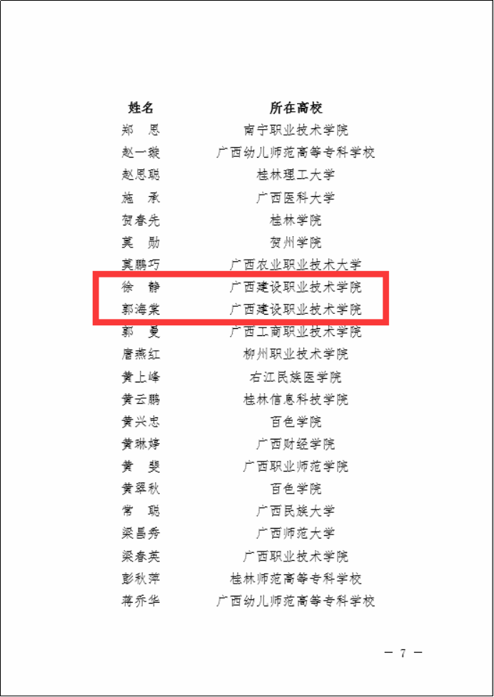 廣西建院8月3日訊(管理工程學院 郭海棠 黃春)近日,廣西壯族自治區教育廳公布了“廣西高校思想政治教育卓越教師”支持計劃第一期支持對象人選名單,我校黨委學生工作部宋倩老師入選“骨干教師”(大學生心理健康教育專職教師類)、管理工程學院郭海棠老師和設備與環境學院徐靜老師入選 “骨干教師”(專職輔導員類)。