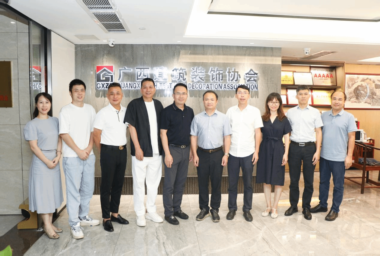 廣西建院9月1日訊(藝術(shù)設(shè)計學(xué)院易楚豪)8月31日,學(xué)校副校長梁偉、藝術(shù)設(shè)計學(xué)院副院長(主持工作)陳菲菲、就業(yè)干事易楚豪一行3人到廣西建筑裝飾協(xié)會秘書處開展交流座談。協(xié)會會長龐耀國、廣西建筑裝飾龍頭企業(yè)代表廣西華輝裝飾集團董事長楊景忠、廣西華藍(lán)裝飾董事長朱建宇、廣西新美格建設(shè)總經(jīng)理李震海、廣西呈美裝飾副總經(jīng)理陳良勇,以及協(xié)會相關(guān)工作人員出席本次會議。