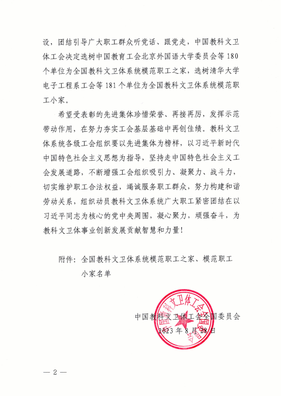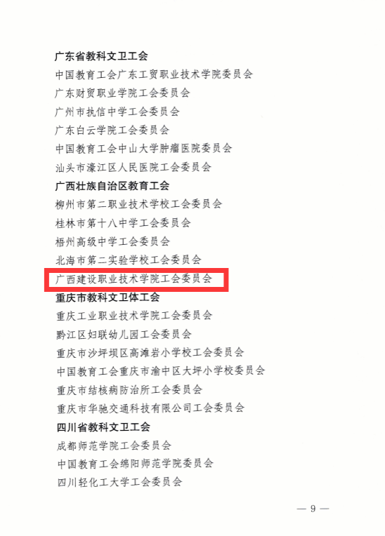廣西建院9月18日訊(工會 陸康)近日,中國教科文衛(wèi)體工會全國委員會印發(fā)《關(guān)于確認(rèn)全國教科文衛(wèi)體系統(tǒng)模范職工之家、模范職工小家的通知》(教科文衛(wèi)體工發(fā)﹝2023﹞14號),我校工會被中國教科文衛(wèi)體工會全國委員會確認(rèn)為全國教科文衛(wèi)體系統(tǒng)模范職工之家。這是全面評價(jià)工會工作的綜合獎項(xiàng),是我校工會有史以來被授予的最高榮譽(yù),全區(qū)只有5所學(xué)校獲此殊榮,我校是其中唯一一所高校。