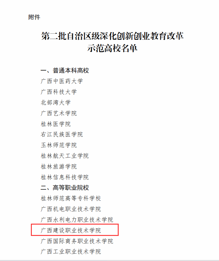 廣西建院10月24日訊(招生就業處 林秀麗)近日,自治區教育廳印發《自治區教育廳關于公布第二批自治區級深化創新創業教育改革示范高校名單的通知》(桂教高教〔2023〕47號),我校獲評第二批自治區級深化創新創業教育改革示范高校。這是我校近年來創新創業教育改革取得的又一豐碩成果。