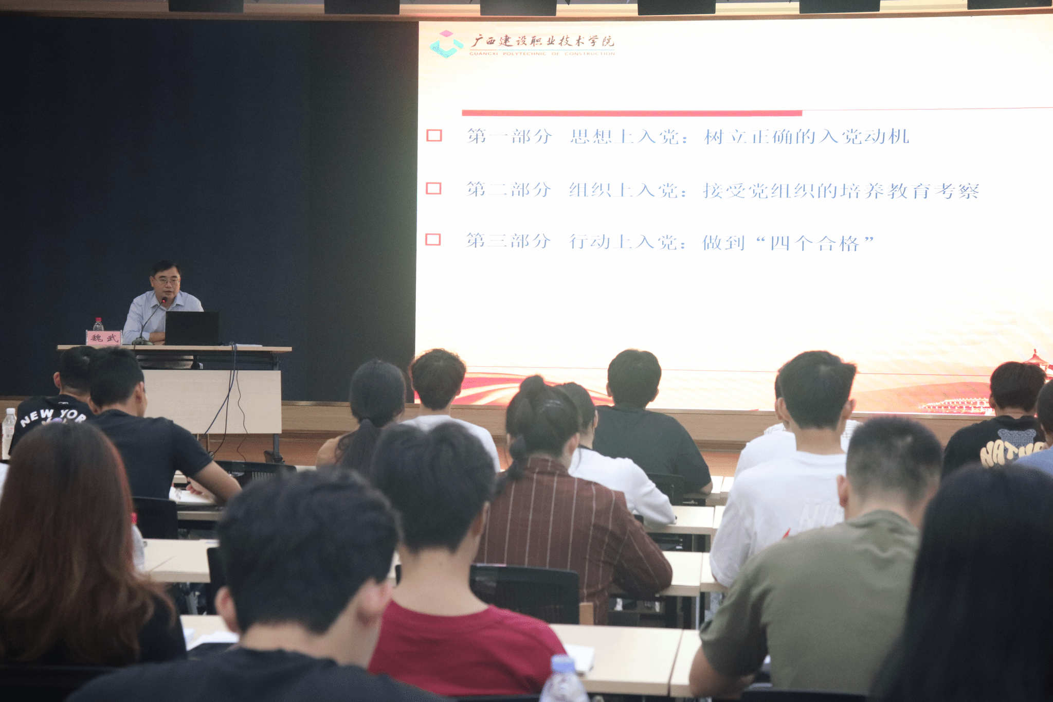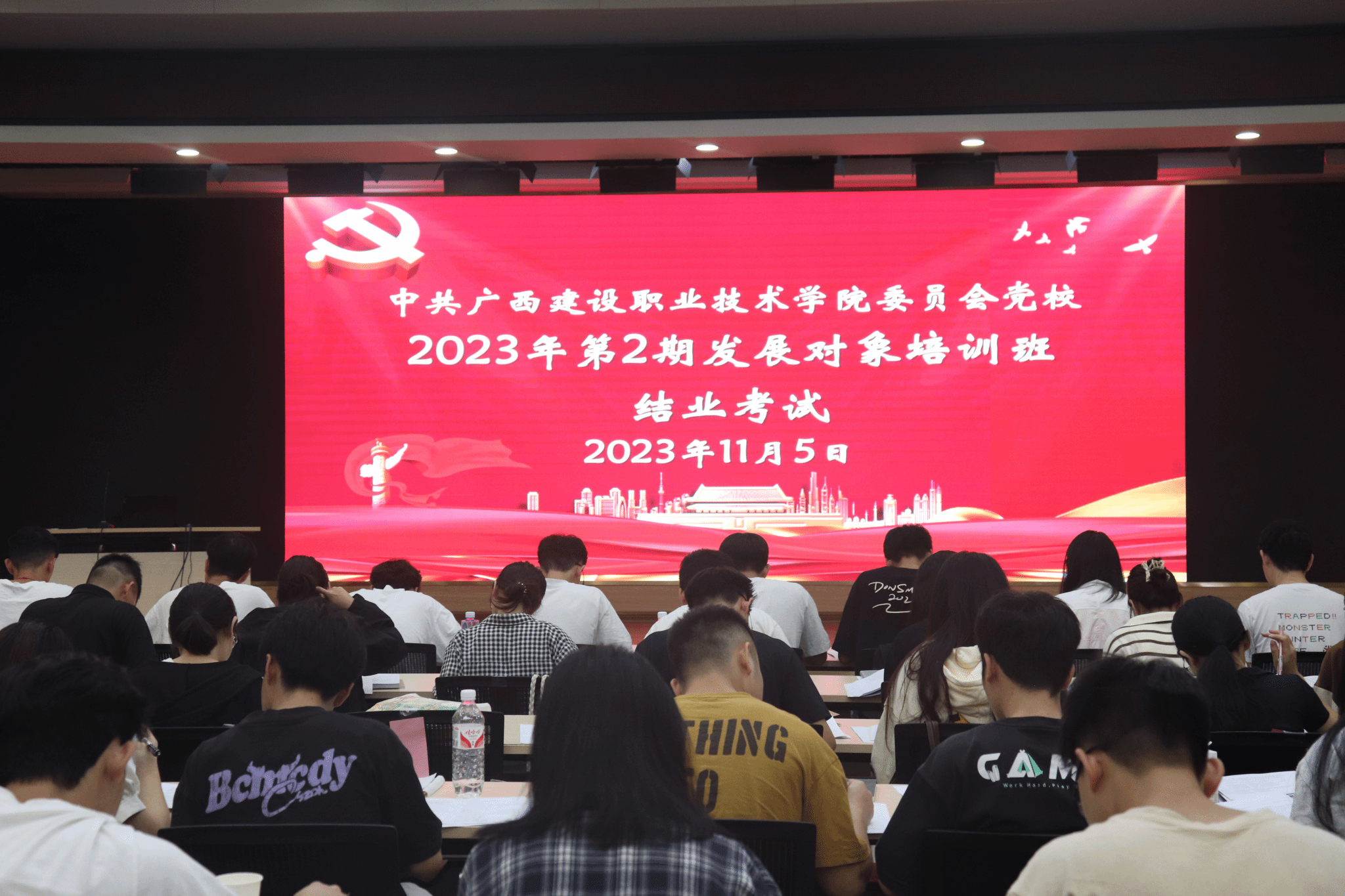 廣西建院11月6日訊(黨委組織部 張玉燕)為貫徹落實習近平新時代中國特色社會主義思想和黨的二十大精神,加強對黨員發展對象的教育培訓,根據《中國共產黨發展黨員工作細則》和學校發展黨員工作安排,經過前期充分準備,中共廣西建設職業技術學院委員會黨校2023年第2期發展對象培訓班于11月3日至5日在學校四教二樓報告廳舉辦。來自各二級學院黨總支、直屬黨支部和校屬企業黨委共80名發展對象參加培訓。培訓以理論授課、社會實踐等多種方式開展,共26個學時。