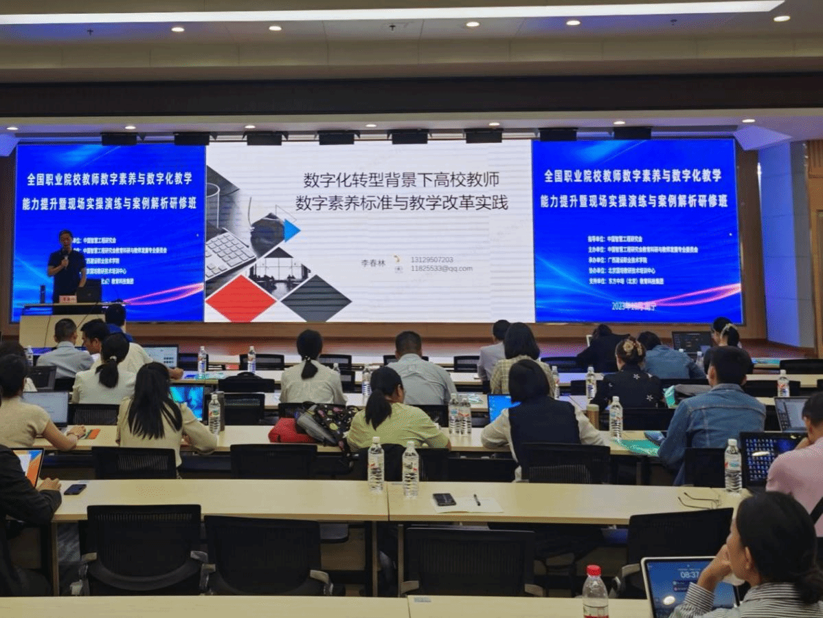 廣西建院10月30日訊(教師發展中心 黃子峻)10月28日至29日,由中國智慧工程研究會教育科研與教師發展專業委員會主辦、我校承辦的全國職業院校教師數字素養與數字化教學能力提升培訓班在四教二樓報告廳舉辦。本次培訓線上線下同步進行,來自區內外20所職業院校的100多名教師參加現場培訓,我校80多名教師參加培訓。培訓由教師發展中心副主任(主持工作)陽艷美主持。