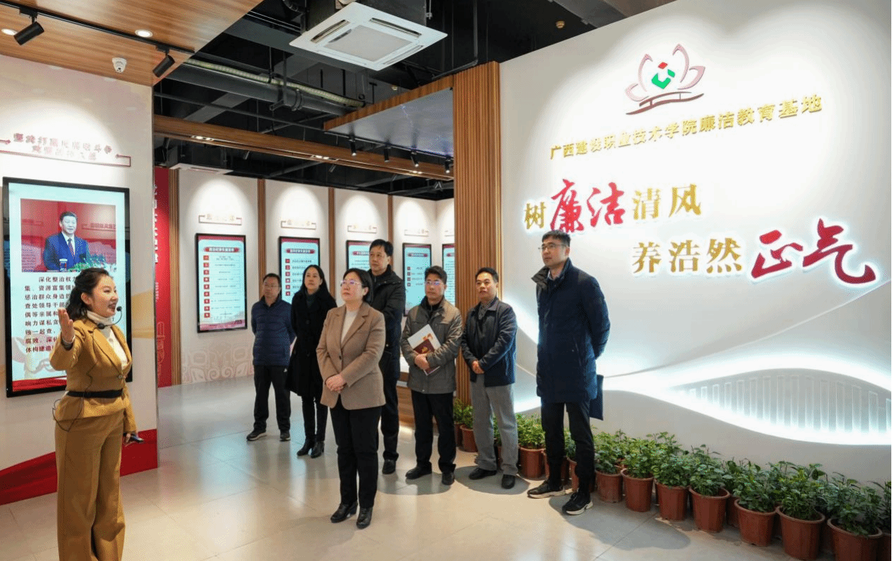 廣西建設職業技術學院廉潔教育基地由宣傳展廳區、培訓教育區和學習交流區三大部分組成,分為“高屋建瓴”“六大紀律”“警鐘長鳴”“清廉建院”“全面從嚴治黨”“育廉新風”等六大展示板塊,將現代多媒體數字技術與廉潔教育相結合,通過多媒體的視聽影像和互動體驗,打造一個生動、直觀、沉浸式的教育環境,將成為學校領導干部和廣大師生陶冶道德情操的重要載體、強化廉潔自律意識的重要平臺、弘揚廉潔文化的重要陣地和開展廉潔教育的生動課堂。