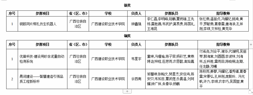 廣西建院4月26日訊(招生就業處 練翠瀅)近日,教育部公布中國國際大學生創新大賽(2023)(原中國國際“互聯網+”大學生創新創業大賽)獲獎名單,我?!朵摻罹W片綁扎仿生機器人》項目榮獲職教賽道銀獎,《優普科技-建設用砂含泥量自動檢測系統》《晟潤建設——智慧建造引領品質工程新標桿》項目榮獲職教賽道銅獎,實現我校在該賽事獲得國家級獎項數量的新突破。此次獲獎是我校繼2021年獲得第七屆中國國際“互聯網+”大學生創新創業大賽職教賽道金獎以來在該賽事上的又一新收獲。至此,我校在此項賽事共奪得1金1銀4銅。