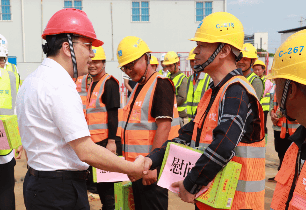 在武鳴校區,黎旭標副廳長一行看望奮戰在項目建設一線的干部職工,向他們致以誠摯的問候和節日的祝福,并送上慰問品。黎旭標副廳長表示,要全力做好后勤服務工作及農民工工資保障工作,特別要做好防暑降溫工作,保障一線作業人員安全健康,同時,要緊繃安全生產之弦,確保職工群眾過一個平安祥和快樂的節日。