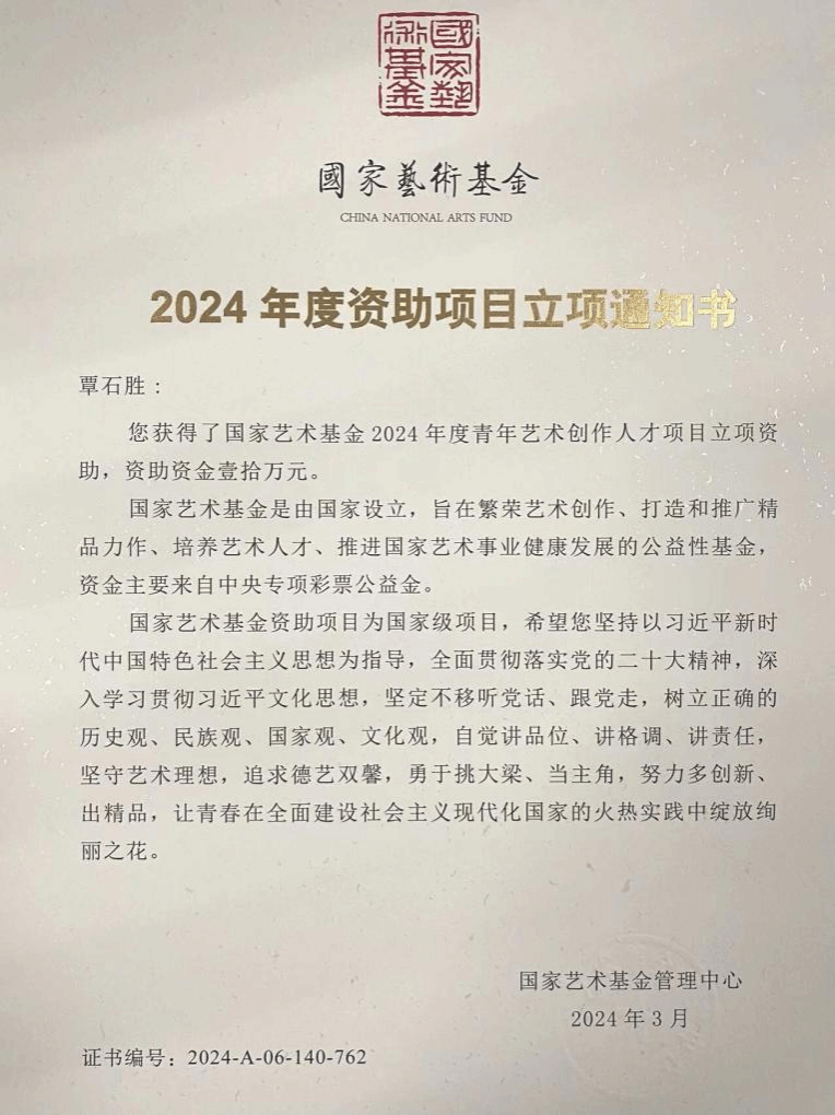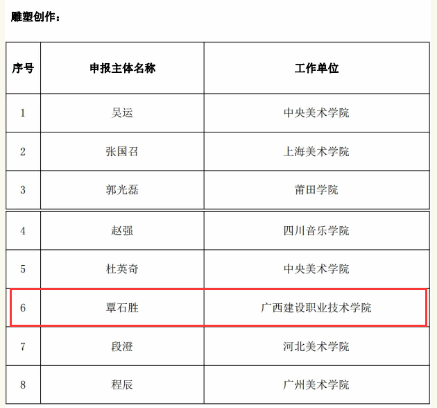 廣西建院5月24日訊(藝術設計學院 高翔)近日,國家藝術基金管理中心公示了國家藝術基金(一般項目)2024年度資助項目名單,我校藝術設計學院覃石勝老師入選青年藝術創作人才資助項目。這是此次資助項目評審全區高職高專入選的唯一作品,也是我校獲得的首個國家藝術基金資助項目。