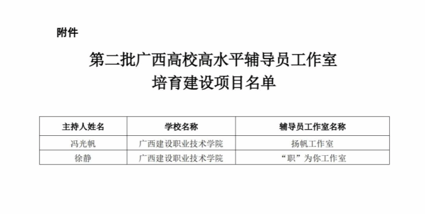 廣西建院8月1日訊(“職”為你工作室 揚帆工作室)近日,自治區教育廳公布第二批廣西高校高水平輔導員工作室培育建設項目名單,我校設備與環境學院輔導員徐靜主持的“職”為你工作室和土木工程學院輔導員馮光帆主持的揚帆工作室雙雙入選。