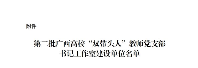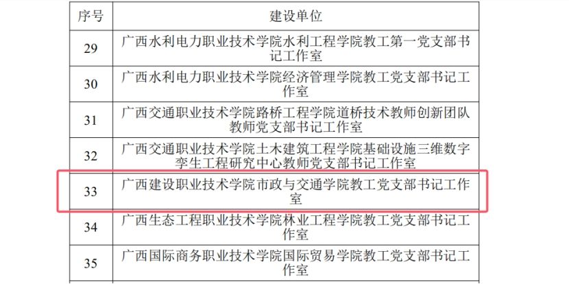 廣西建院8月11日訊(黨委組織部)近日,自治區黨委教育工委公布第二批廣西高校“雙帶頭人”教師黨支部書記工作室建設單位名單,我校市政與交通學院教工黨支部書記工作室成功入選,成為我校第二個廣西高校“雙帶頭人”教師黨支部書記工作室建設單位。