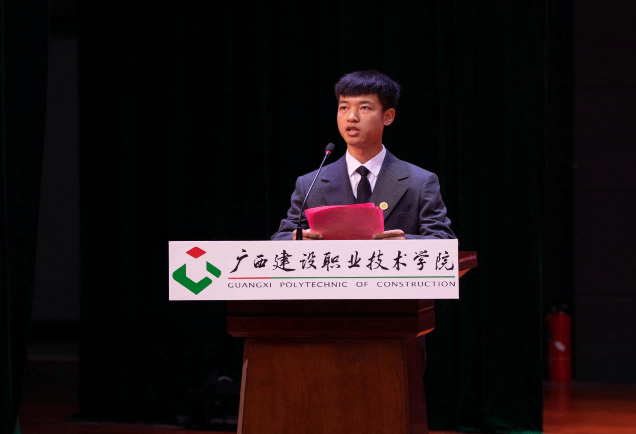 大會在莊嚴的國歌聲中拉開序幕。劉曉紅書記授予新生代表學校徽章,全體新生起立,莊嚴地將校徽佩戴于胸前,從此與建院血脈相連,“厚德 勵學 敦行”的校訓精神在一代代廣西建院人中薪火相傳,匯聚成奮進新時代的精神力量。
