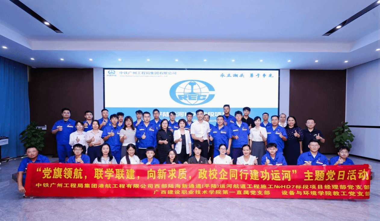 廣西建院9月15日訊(繼續(xù)教育學(xué)院 甘思源)近日,廣西建設(shè)職業(yè)技術(shù)學(xué)院與中鐵廣州工程局集團(tuán)港航工程有限公司在西部陸海新通道(平陸)運(yùn)河航道工程施工№HD7標(biāo)段項(xiàng)目經(jīng)理部簽署黨建共建協(xié)議,跨上黨建共建、資源共享、共同發(fā)展新臺(tái)階。簽訂儀式后舉辦了以“黨旗領(lǐng)航,聯(lián)學(xué)聯(lián)建,向新求質(zhì),政校企同行建功運(yùn)河”為主題的黨日活動(dòng),學(xué)校柏挺副校長,第一直屬支部委員會(huì)、設(shè)備與環(huán)境學(xué)院教工支部委員會(huì)、土木工程學(xué)院教工第二支部委員會(huì)的黨員代表參加活動(dòng)。