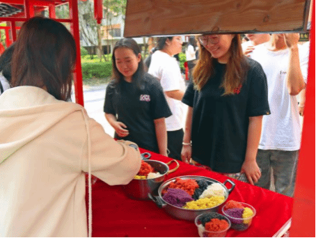 市集現場,最具壯族特色的油茶和五色糯米飯成為焦點。師生們排隊品嘗醇香微苦的油茶,感受侗族、瑤族等少數民族的待客之道;五色糯米飯則以天然植物染色的繽紛色彩和軟糯口感贏得一致好評。“第一次喝油茶,味道很特別!五色糯米飯不僅好看,還有淡淡的植物清香。”土木工程學院的高建2304班的盧勇燁同學興奮地分享道。