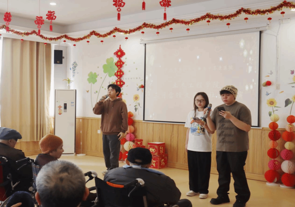 活動現場,志愿者們為老人們獻上了一場精彩紛呈的文藝盛宴。山歌對唱《多謝了》以悠揚婉轉的歌聲傳遞感恩之情;蒙古獨舞《美麗的草原》用剛柔并濟的舞姿展現草原壯美;小組合唱《明天會更好》以真摯歌聲傳遞美好祝愿,引得在場老人情不自禁跟著哼唱;群舞《相親相愛一家人》則用整齊劃一的動作詮釋了鄰里和諧。整場演出高潮迭起,掌聲不斷,既展現了土木學子的藝術才華,更傳遞了學子們敬老愛老的溫暖情懷。