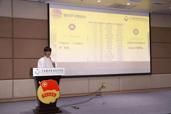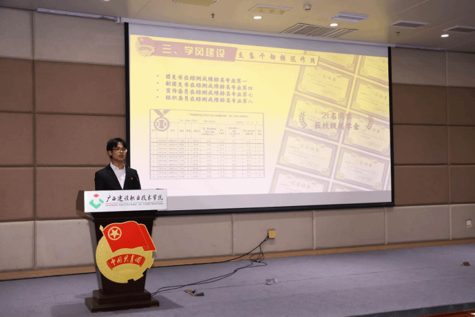 “紅旗團支部”建管2304班團支部代表韋富成同學在展示評比活動現場