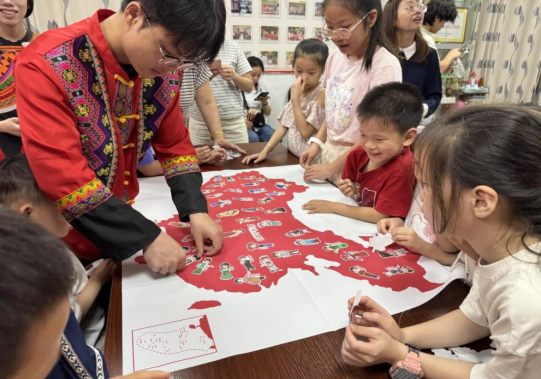 “衣脈相承”民族服飾變裝活動(dòng)中,身著各民族服飾的志愿者向居民細(xì)致講解服飾特點(diǎn)與文化內(nèi)涵。他們邀請(qǐng)居民參與“民族服飾貼紙互動(dòng)”,將56個(gè)民族服裝貼紙拼貼在中國地圖上,以創(chuàng)意形式展現(xiàn)“中華民族一家親”的深刻內(nèi)涵。活動(dòng)尾聲,全體人員合唱《愛我中華》,激昂的歌聲將民族團(tuán)結(jié)的溫情推向高潮。