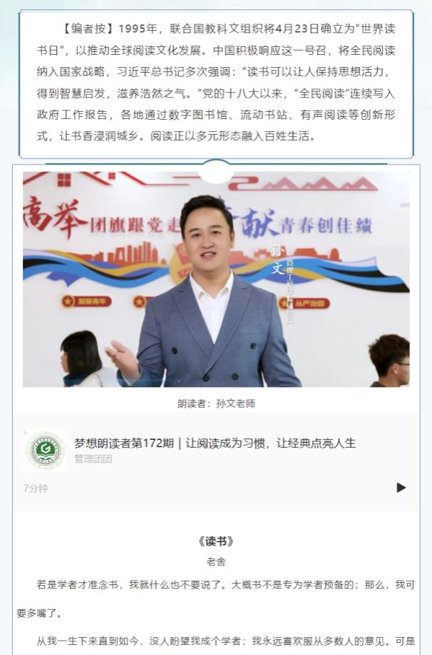 依托“夢想朗讀者”特色育人品牌,學院舉辦第172期“夢想朗讀者”活動,響應全民閱讀國家戰略,以構建全民學習共同體為目標,通過“品牌內涵升級、活動體系構建、長效機制建設”育人模式打造閱讀沉浸式體驗、實現區域文化育人的傳承與創新。