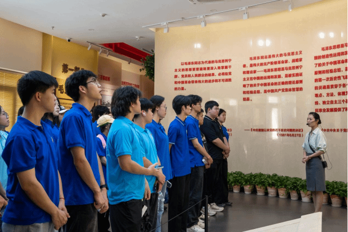 祭掃活動結束后,師生們前往毛主席接見廣西各族人民紀念館參觀學習。在“南寧會議”展區,講解員詳細介紹了1958年毛主席主持召開的南寧會議,以及會議對廣西經濟發展的戰略指導。同學們駐足觀看毛主席當年審閱的廣西發展規劃文件,深刻理解了“從群眾中來,到群眾中去”的工作方法。在“關懷壯鄉建設”板塊,陳列的農具、糧票等實物,展現了毛主席對廣西農業、工業發展的長遠布局。“我們今天的幸福生活,離不開老一輩革命家的高瞻遠矚。”團員吳毅京在參觀后忍不住感嘆道。