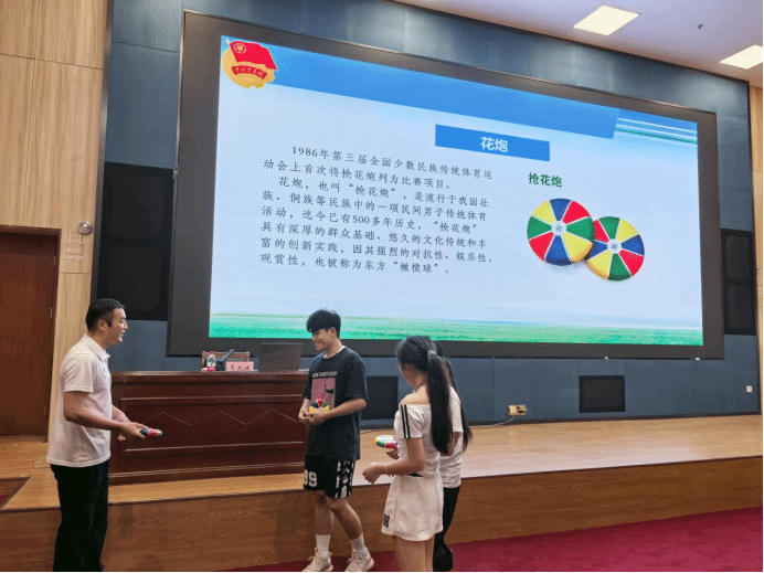 講座現(xiàn)場,一段全國少數(shù)民族傳統(tǒng)體育運動會搶花炮視頻片段吸引了全場目光,韋凱旋以搶花炮運動文化為切入點,引出民族體育促進鑄牢中華民族共同體意識及新時代青年在鑄牢中華民族共同體意識中挺膺擔當?shù)木蕛?nèi)容。他從牢固樹立“四個與共”的共同體理念和不斷增強“五個認同”方面深入講解鑄牢中華民族共同體意識的重要意義。同時現(xiàn)場設置了搶、傳花炮體驗區(qū),學生們仔細聽規(guī)則、相互配合,在實踐中感受搶花炮運動的魅力。