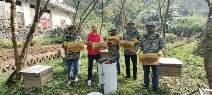 溫昌盛(左二)和蜂民們在加八屯蜂蜜豐收現場