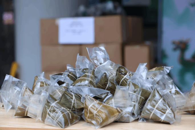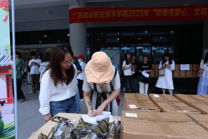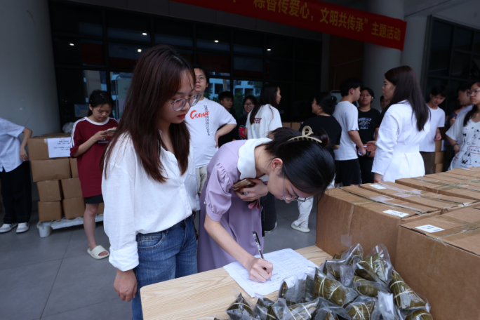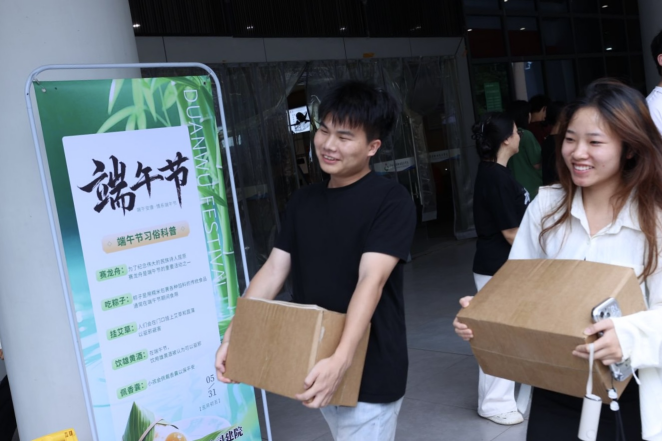 本次活動由學校第一食堂廣西萬鄉河餐飲集團有限公司全額贊助,提供多種口味的粽子,包括板栗肉粽、黑米肉粽等,滿足學生的不同需求?;顒蝇F場,后勤管理處的老師們精心組織,各學院代表有序領取,歡聲笑語中洋溢著節日的喜悅。