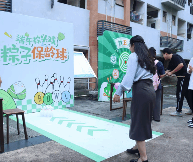 游園會共設置四大主題體驗區:在“射藝驅五毒”展位,參與者以傳統弓箭射擊象征瘟疫邪祟的靶標,在投壺競技中感受古人“雅射”之禮;“粽趣保齡球”區域將端午元素與現代運動結合,特制造型瓶柱與端午主題彩球碰撞出陣陣歡笑;“古韻套圈”讓參與者在投擲間體驗傳統游戲的雅致與歡愉;“巧手制香”工坊重現傳統市集風情,師生們穿針引線,親手縫制艾草香囊。活動全程采用“通關文牒”集章制,完成所有項目可兌換粽子獎品。