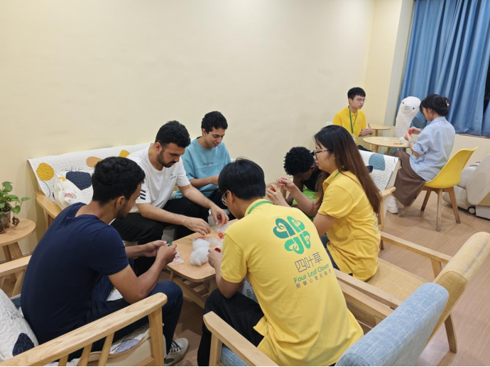 20余名留學生來到心靈驛站,和小草們一起在飛針走線間縫制可愛的皮革柿子鑰匙扣。大家用指尖的創意鏈接彼此,建起中外學子友好交流的橋梁。