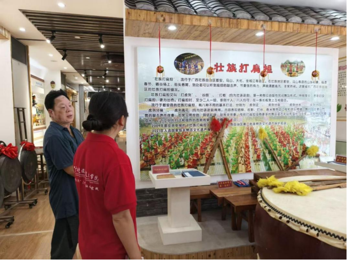 在文化館唐老師的生動講解下,隊員們了解到壯族打扁擔、瑤族銅鼓舞等國家級非物質(zhì)文化遺產(chǎn)。唐老師特別強調(diào):“這些舞蹈不僅是娛樂形式,更是民族歷史與生產(chǎn)生活的活態(tài)記錄。”都安民族博物館則以瑤族文化、脫貧攻堅、都安特色文化歷史為主題,展示了都安人民的生活方式和文化特色。