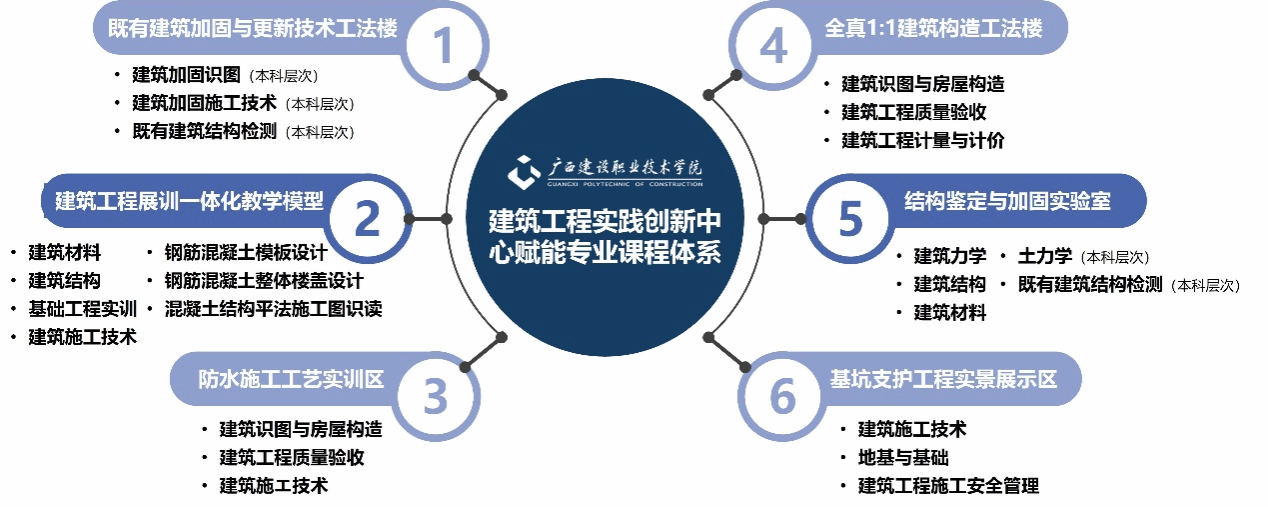 中心采用“理實一體、虛實結(jié)合”的教學(xué)模式,重點建設(shè)了六大特色實訓(xùn)區(qū):建筑工程展訓(xùn)一體化教學(xué)模型、全真1:1建筑構(gòu)造工法樓、基坑支護(hù)工程實景展示區(qū)、防水施工工藝實訓(xùn)區(qū)、結(jié)構(gòu)鑒定與加固實驗室以及既有建筑加固與更新技術(shù)工法樓,全面覆蓋建筑工程領(lǐng)域的關(guān)鍵技術(shù)節(jié)點。
