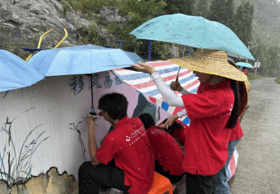 實踐團成員冒雨繪墻(圖/李兆健)
