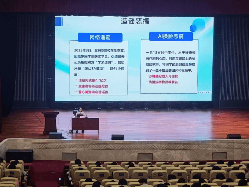 9月17日,設備與環境學院在學校禮堂舉辦網絡安全教育專題講座,主題為“管好手中設備,筑牢文明防線——做數字時代的合格‘操盤手’”。馬克思主義學院黃海蓮老師應邀主講,2025級全體新生參加。