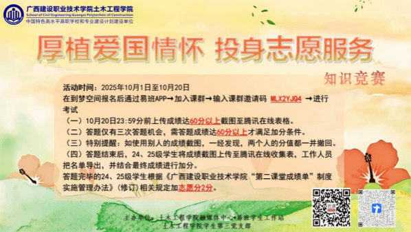 投身志愿服務,擔當時代之責。學院積極引導學生將愛國情懷轉化為服務社會的實際行動。“厚植愛國情懷,投身志愿服務”知識競賽普及了志愿服務理念;而“愛國衛生運動,共創文明城市”與“共清邕江之畔,同賀祖國華誕”公益環保志愿服務活動則提供了實踐平臺。師生們共同勞動,美化家園,以實干精神詮釋了“強國復興有我”的責任擔當,展現了土木學子的良好風貌。