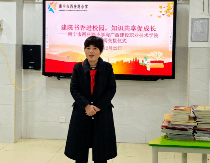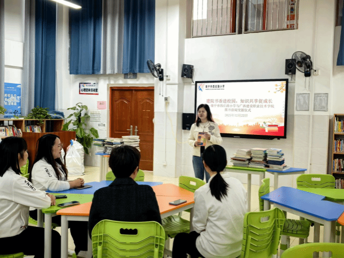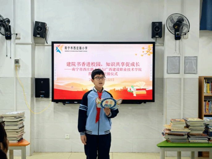 交接儀式在西莊路小學二樓多媒體教室舉行,兩校師生代表共同見證了這一溫馨而意義深遠的時刻。西莊路小學校長盧雪麗在致辭中高度肯定了閱讀對青少年成長的關鍵作用,她表示:“這些書籍不僅是知識的載體,更是點亮孩子心靈的明燈。感謝建職院以如此務實的方式,為基礎教育注入了豐沛的文化活水。”隨后,學生代表為我校嘉賓佩戴上鮮艷的紅領巾,這一動人場景生動詮釋了“知識傳遞,情誼相連”的深刻內涵。