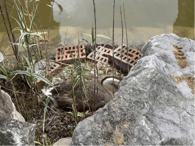 守護行動中,工作人員小心翼翼地劃著皮劃艇靠近小島,全程輕手輕腳,避免驚擾到正在孵蛋的母鵝。到達小島后,工作人員仔細觀察孵化巢的位置和周邊環境,用事先準備好的磚頭,小心翼翼地在孵化巢周圍搭起簡易防護欄,穩穩固定住孵蛋位置——既能擋風,又能防止巢體移位,給“蛋寶寶”們筑牢了“安全小窩”。