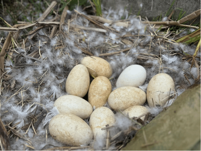 上島后發現,兩只母鵝的“育兒風格”各有不同:一只母鵝順利產下10枚鵝蛋,正日夜堅守在巢中,用身體溫暖著每一枚蛋,專注地履行孵蛋職責;另一只同樣產了10枚蛋,卻不知犯了什么“小脾氣”,居然把3枚蛋推到了河邊,只留下7枚精心孵化,工作人員戲稱:“難道這是在用獨特方式篩選最強‘蛋寶寶’嗎?”
