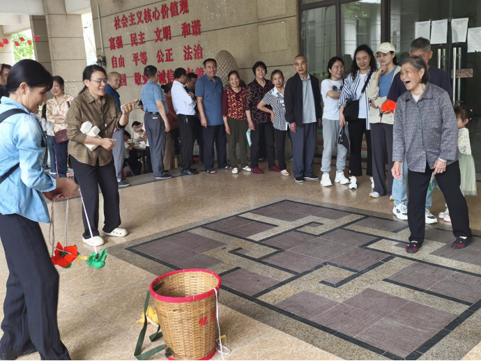“健身強(qiáng)體魄 健康伴我行”環(huán)節(jié)將活動(dòng)推向高潮。除了開場(chǎng)精彩的“投繡球”吸引各年齡層居民一試身手,“踢毽子”區(qū)域也熱鬧非凡。體育教師黨員充分發(fā)揮專業(yè)特長(zhǎng),結(jié)合社區(qū)居民的年齡特點(diǎn),現(xiàn)場(chǎng)示范動(dòng)作要領(lǐng),耐心指導(dǎo)居民參與。黨員同志們積極參與其中,與社區(qū)居民一同運(yùn)動(dòng)、歡笑,在活躍身心的同時(shí),也融洽了鄰里情感,營(yíng)造了崇尚健康、鄰里和睦的社區(qū)氛圍。