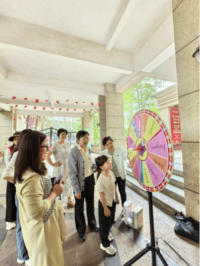 “轉(zhuǎn)動(dòng)大轉(zhuǎn)盤,學(xué)英語真簡(jiǎn)單!”色彩鮮艷的英語大轉(zhuǎn)盤成為活動(dòng)最受歡迎的“打卡點(diǎn)”。在“轉(zhuǎn)盤添雅趣 英語悅時(shí)光”環(huán)節(jié)中,英語教師黨員精心準(zhǔn)備了以水果、動(dòng)物等日常用語為主的英語單詞,吸引了青少年和家長(zhǎng)們紛紛參與。當(dāng)轉(zhuǎn)盤指針定格后,大家主動(dòng)嘗試讀出單詞及中文釋義,遇到發(fā)音不準(zhǔn)的問題,英語教師黨員便耐心指導(dǎo)、逐字糾正,并分享單詞記憶小技巧,讓居民們?cè)谳p松愉快的游戲氛圍中打破語言壁壘,掌握實(shí)用英語表達(dá),現(xiàn)場(chǎng)學(xué)習(xí)氛圍濃厚而愉悅。