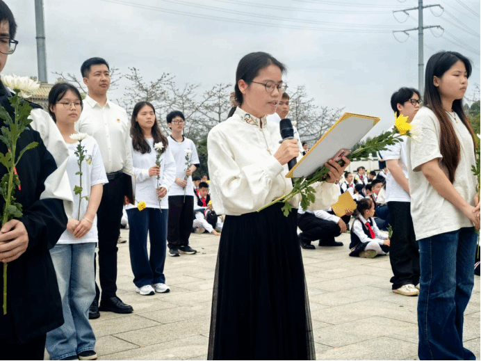 活動現場,我校覃芳芳、馬凱老師帶領同學們朗誦《捍衛這盛世之中華》。師生們精神飽滿、語調鏗鏘,以真摯情感追憶英烈事跡,傳遞青年捍衛盛世中華的堅定信念。覃芳芳老師朗誦的《如果我生活在那個年代》,將對英烈的崇敬與對初心的堅守融入誦讀,深情訴說著對革命先烈的崇敬與感恩。隨后,師生通過獻花等質樸行動表達追思。
